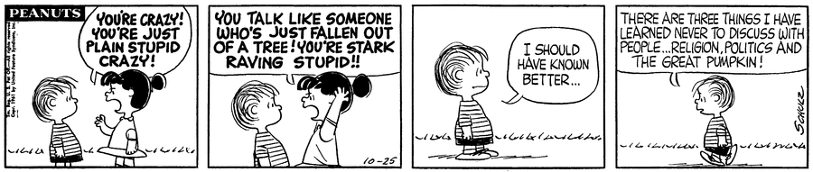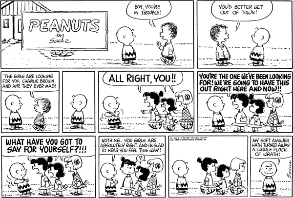 Chuck sees the Linusians and Lucinians argue throughout Peanutsville and reminds them that the Christmas Provider wouldn't like it so they pretend to agree with each other.