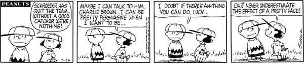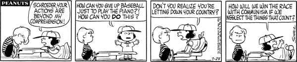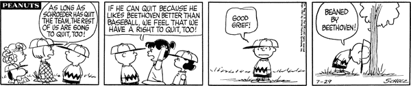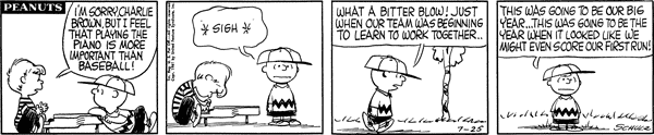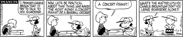 Mr. Manager part 130; Luc is told that concert pianists make more money than baseball catchers and gives up convincing him for the day. Lunus introduces the Lower Courts Act of 1962 which sets up lower courts over the Brown cluster, Van Pelt cluster, the small countries of Pig-Pen and Shermy, the countries of Patty, Violet and Schroeder, and the countries of Frieda and Faron while scheduling new acts for every time the number of countries in The UNOP changes, while slipping in a clause banning prioritization of any topic.558