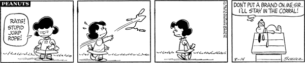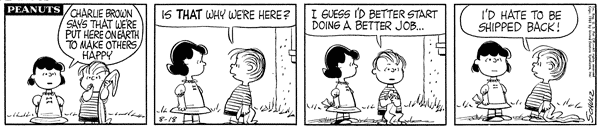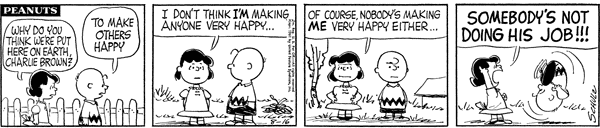 Luucy asks Chuck if peoples purpose is to make others happy what others are there for. Lunus decides to run for Li's seat knowing he can't keep his own seat.CB 2791 Lucy 1428 Snoopy 1187 Linus 998