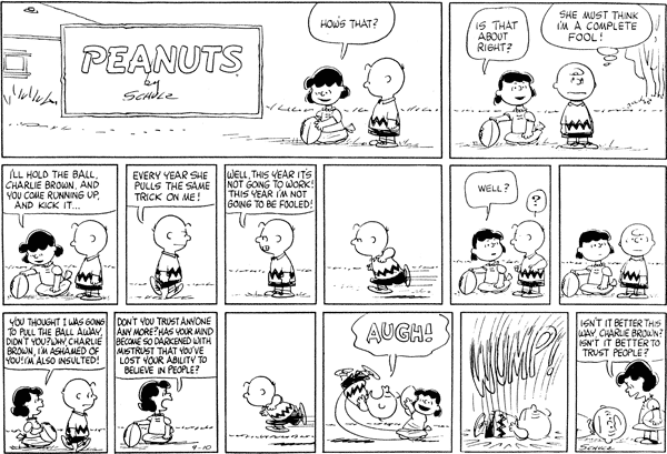 Lucy's football controller convinces Charlie Brown to try to launch the football to trust people but she rigs it like usual.