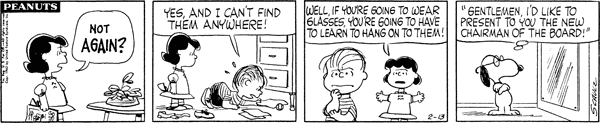 Glasses part 9; Linus shakes down Snoopy's Scavengers for the enhancements but they decide Linus was jealous of them.