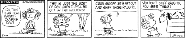 Glasses part 8; Frieda try's to get Snoopy's Scavengers to sniff out rabbits (they're trying things that the Scavengers are less likely to accept for some reason) and they respond that you see rabbits instead of sniff them because they have Linus' watchtower enhancements.47