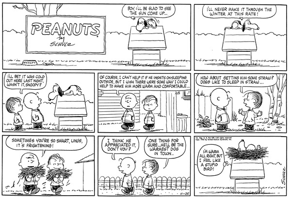 Luucy sees the countdown sign until Beethoven's birthday who cares and then sees a Snoopian sign saying We DO!583