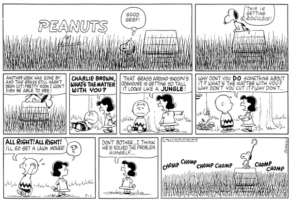 Luucy yells at the Keeper of the Scavengers to do something about the grass but by the time he finally starts they summon sheep to graze the grass.