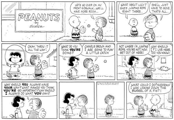 Chuck and Lins' children try to play catch but Luucy's daughter scares them off because she's jump roping where they were.
