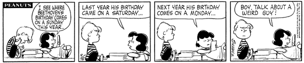 Luucy's daughter tells Schroe that she thinks its weird that Beethoven's Birthday changes days of the week.579