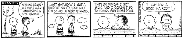 Sherm gets mad that he got a haircut but was sick for several days and by the time anyone could see him no one could notice the cut.267