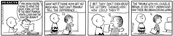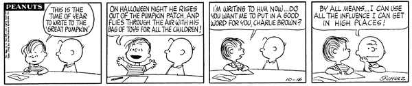 Lins decides to send the same form letter to the Great Pumpkin, Christmas Provider and Easter Messenger and tells Chuck that the Great Pumpkin is naïve so he won't believe it.