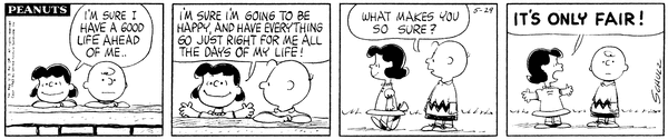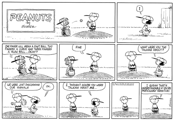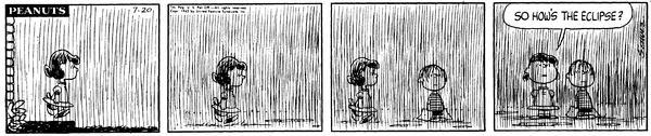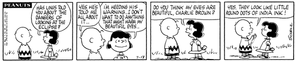 Eclipse part 4; Luucy and Chuck talk about the eclipse and she decides that it would hurt her beautiful eyes and he agrees saying her eye look like dots of India ink.