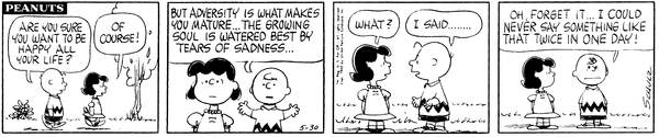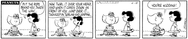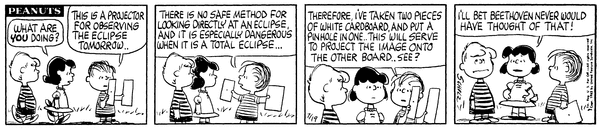 Eclipse part 4; Luucy and Chuck talk about the eclipse and she decides that it would hurt her beautiful eyes and he agrees saying her eye look like dots of India ink.