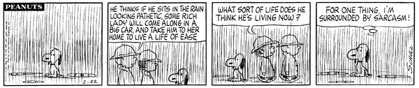 Snoop tries to stand in the rain hoping to get picked up and live in a beautiful home but decides that its unlikely.
