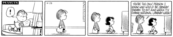 19630422                      National Library Week part 1; Lins is reading about policy and discovers that Luucy's daughter is watching TV and says she's the only one who would read during National Library Week.