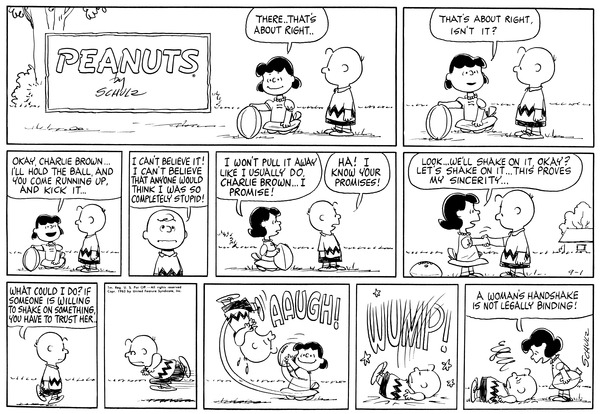 Lucy's football supervisor makes a handshake agreement with Charlie Brown to not rig the football but she rigs it anyway because the handshake wasn't legally binding.