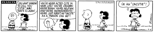 Cutie part 1; Luucy asks Schroe (jokingly) why she isn't called cutie and he responds its because she isn't cute and she gets annoyed because she hates reasons.608