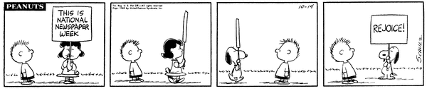 19631014                     National Newspaper Week part 1; Luucy and Snoop put of signs that announce that it's UNOP newspaper week. Fiften moves in with his children as if he was appointed representative.