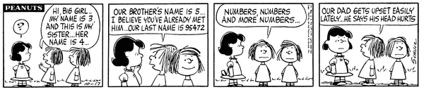 19631019                             Chuck and Lins finally warm up to Fiften as a person and start wondering what number Charlie Brown would be if it were a number and land on 3.1416. Luucy decides to support Fiften.