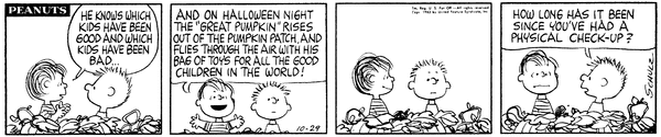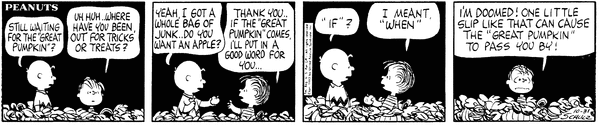 Lins says that if the Great Pumpkin comes he will put a good word in for Chuck but then gets worried because he said if.