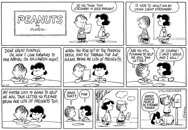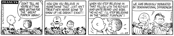 Chuck tries to convince Lins to not believe in the Great Pumpkin but says that he will when Chuck stops believing in the Christmas Provider. Chac has mass defections of people to the safety of Luci.
