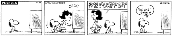 19631125                              Snoop is watching the TV at the representative building, but then Luucy's daughter turns it off because no one was watching it.