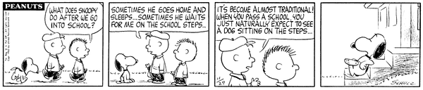 19631129                           Fiften wonders what Snoop does while the children are at school and Chucketa's son tells him that he usually just sits on the steps.