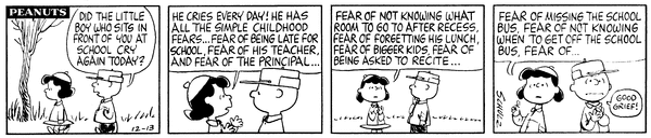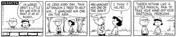 Luucy's daughter is worried about a boy who sits in front of her and cries so she hits him to take his mind of his emotional problems.