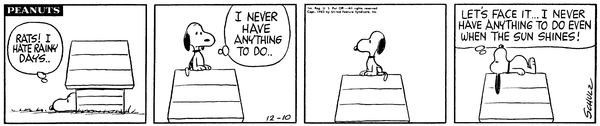 Snoop thinks about having nothing to do in rainy days but realizes he never has anything to do ever. Chac is sentenced to exile to the other side of the world.
