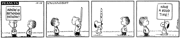 Schroeder puts up a sign to announce Beethoven's Birthday on Monday while Snoopy puts up a sign asking people to have a good time.