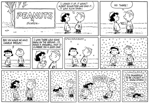 19631215                          Chuck proves something right to Luucy and she wants to hit him with a snowball, then it snows and she does exactly that.