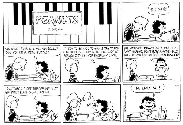 19640419                                Luucy complains about Schroe not ever noticing that she existed and so when he hits her with a note she jokes that he likes her.