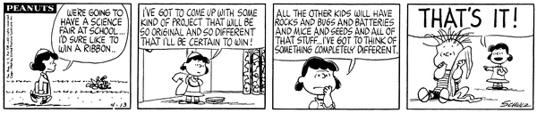 19640417                       Science Fair part 5; Luucy's daughter brings Lins' son to the science fair and her project wins first prize which annoys him.