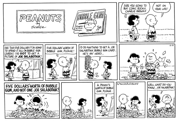 19640412                                  Chuckson by piles of bubblegum cards to try to find a card with Joe Shlabotnik, then sees that Luucy's daughter buys one and gets it.