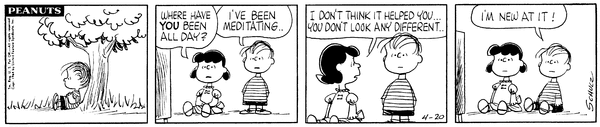 19640420                       Lins meditates at a tree and tells his fiancĂ© about it and she remarks that he doesn't look different and he decides he's new at it.