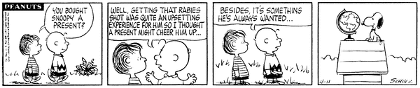 Rabies Shot part 5; Chuck decides to give Snoop a present to cheer him up after the rabies shot and so gives him a globe.