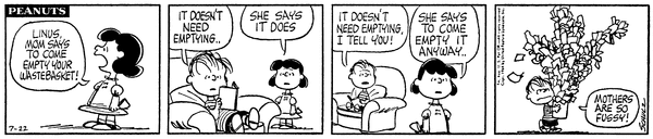 Luucy tells Lins' son to empty his wastebasket and he continues to say it doesn't need emptying while the trash piles into the air but reluctantly does it.