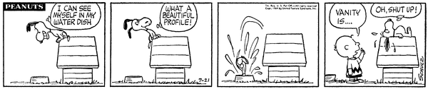 Snoop sees himself in his cup and calls himself beautiful but falls into it so Chuck begins to give a quote about vanity.