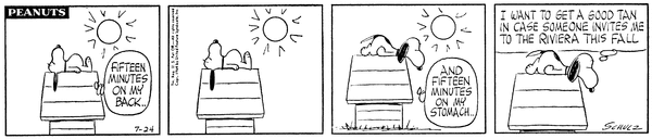 Snoop starts a lying down in the sun regiment so that he can get a good tan in case someone invites him to Rivera in the fall.