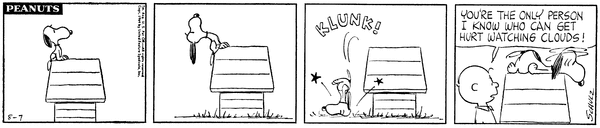 Snoop tries to watch the clouds but leans so far back that he falls off his house and gets hurt which Chuck laughs at.