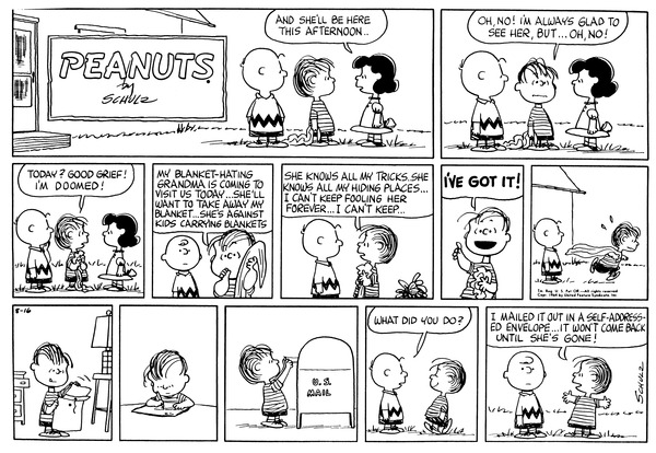 Blanket Hating Grandmother part 16; The BHG is about to focus on the Van Pelts again so Linus packs up the wall and sends it to itself to arrive when the focus is gone.