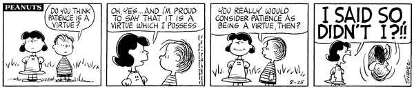 Lins' son asks his sister (as I will refer Luucy's daughter in relation to him) if patience is a virtue and she says yes and that she has it but when he asks again she yells that she already said so.