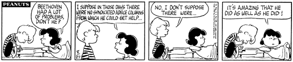 Lu says that Beethoven had a lot of problems and since there were not any syndicated advice columns it is surprising that he did as well as he did.639