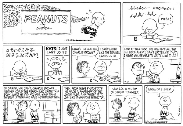 Chucketa's son tries to learn how to write cursive letters but Lins' son shows him that in the book the person who wrote it cheated by making copies of the best letters and he wonders who to sue.