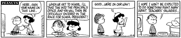 Linus For President part 2; Lins' son begins his campaign by being entered into the race for school president and he hopes he won't be asked about teacher's salaries.