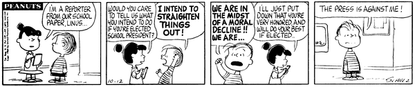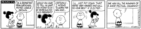 Linus For President part 7; The Violetian reporter of the school asks Lins' son what he intends to do if elected, but when he tries to give a speech she just puts down that he'll be honored and will do his best if elected.
