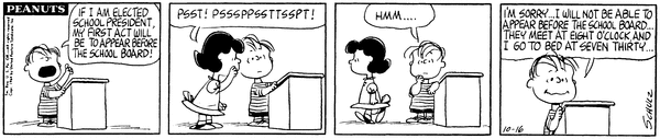 Linus For President part 11; Lins' son says that he will appear before the school board as his first act but then he finds out that it meets after his bedtime.