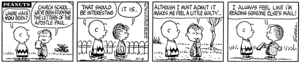 Lins' son starts reading the letters of Apostle Paul but it makes him feel guilty like he is reading someone else's mail.