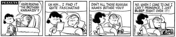 Lins is reading "The Brothers Karamazov" and is asked by Luucy if the Russian names bother him and he says that when he can't pronounce one he bleeps right over it.