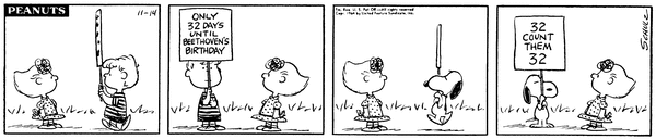 Schroeder puts up a sign announcing that it will be 32 days until Beethoven's Birthday and so Snoopy puts a second sign to make fun of it saying "32 count them 32".642