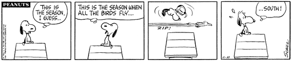 Snoop realizes that it is the season when all the Bards fly south and then ones flies right under him going that way.