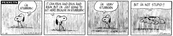 Snoop wants to be stubborn and sit in the rain but decides that despite his stubbornness he isn't stupid and goes inside.