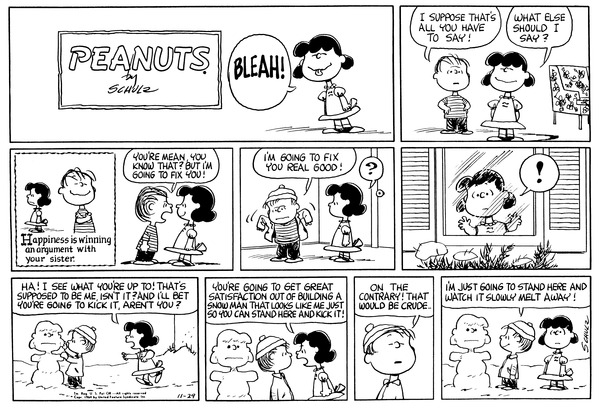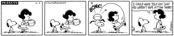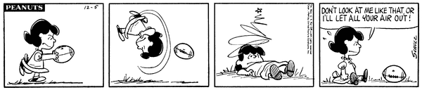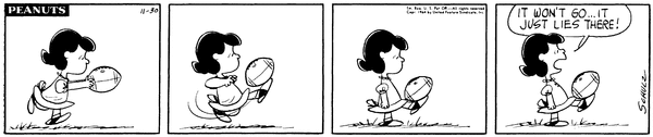 Football part 6; Luucy tries to kick the football but trips over herself and threatens to let the air out of the football for looking at her funny.Lucy 1897 Snoopy 1641 Linus 1500 XCB 4